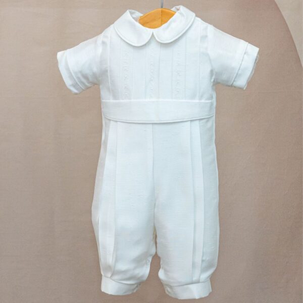Suit details: Ivory white color, which reflects purity and simplicity.Bodice with delicate vertical embroidery, adding a subtle decorative detail.Peter Pan type collar, which provides a traditional and tender touch.Cut at the waist with a smooth band, for a comfortable and elegant fit.Baggy pants with pleats that give a classic and sophisticated look.Cuffs with lace details, highlighting its delicacy. Short sleeves, perfect for events in warm climates.