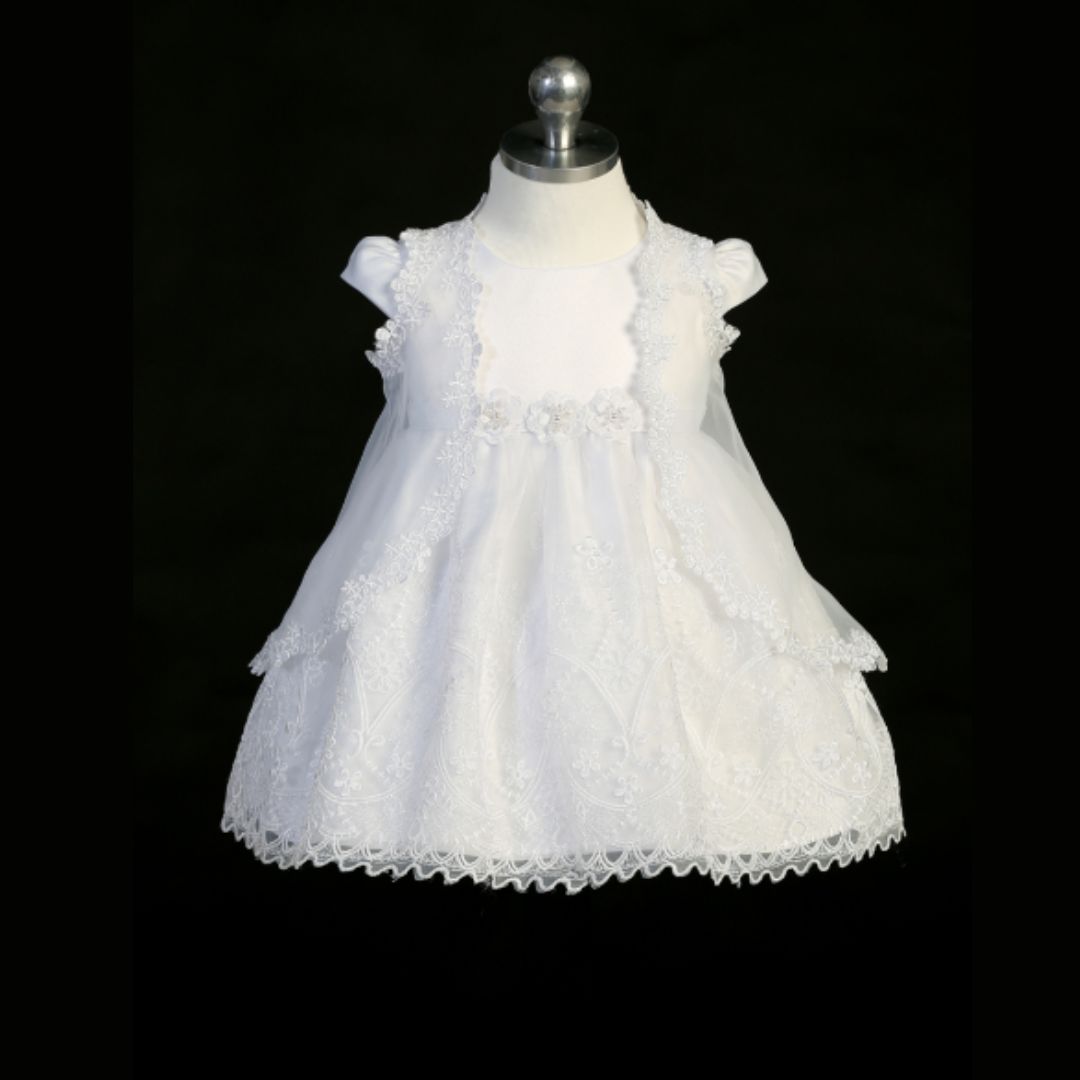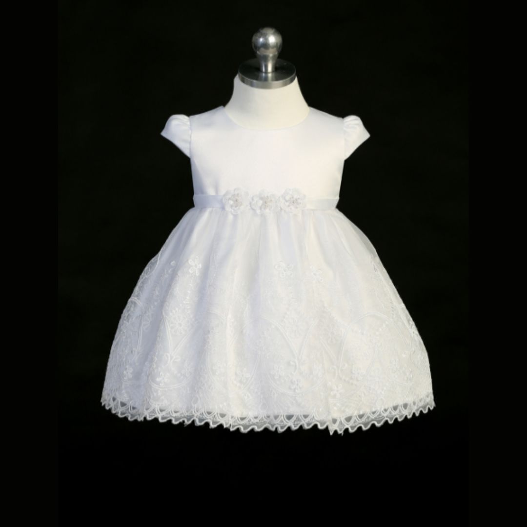 - Dress: Short white dress. The bodice is plain (satin or silk) with short sleeves. The skirt is covered in delicate floral lace and has a scalloped hem. The waist is accentuated by a thin satin bow and three beaded fabric flowers.