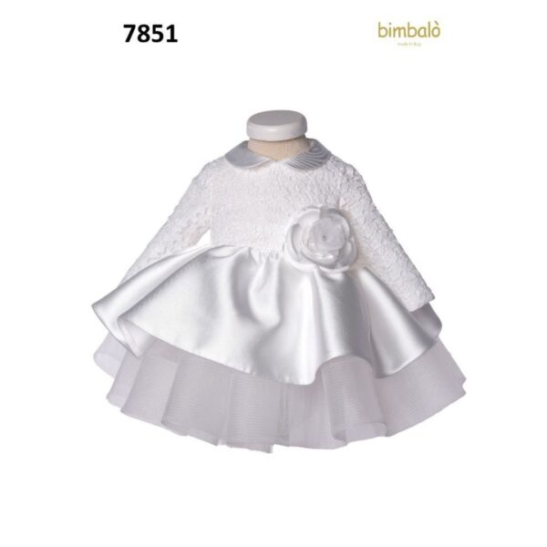- Exquisite christening or ceremony dress, made in Italy, by Bimbalò (Style 7851). The pure white design features a long-sleeved lace bodice with an elegant Peter Pan collar. It stands out with its voluminous satin skirt and a large 3D flower at the waist. A luxurious outfit for the day of the christening.