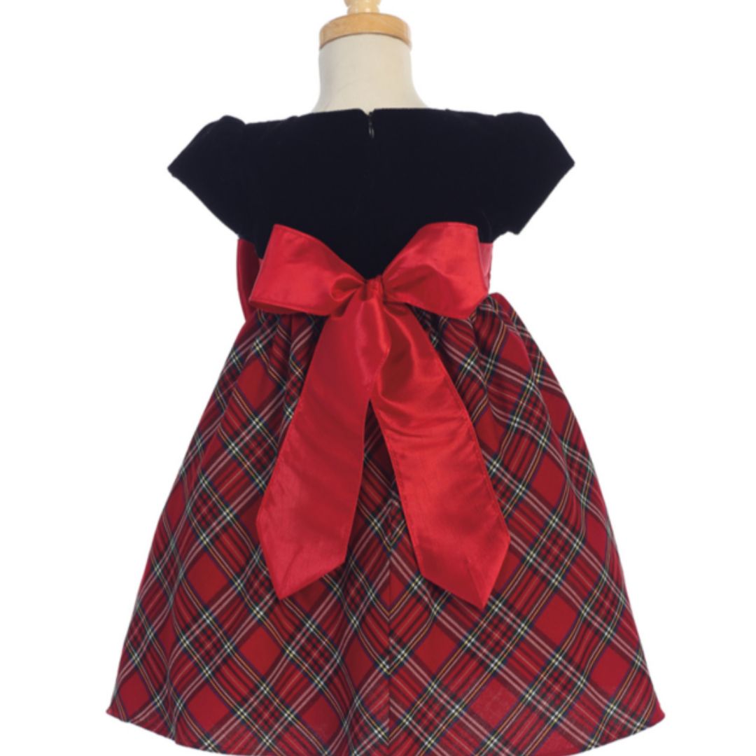 - Black Velvet and Red Tartan Dress with Satin Bow for Girls
