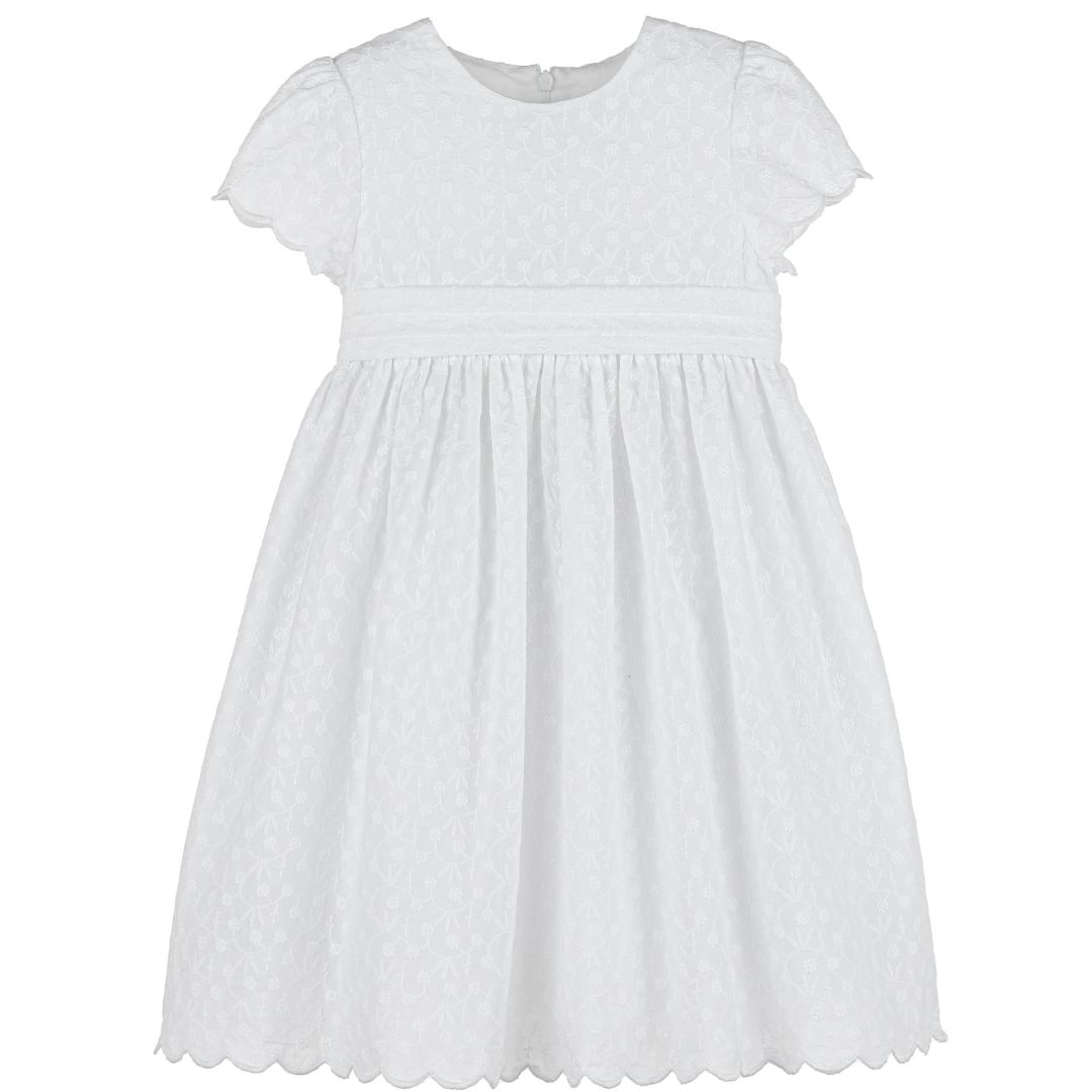 - Elegant short-sleeved white dress with delicate all-over floral embroidery, a sash at the waist, and scalloped hems. Perfect for baptisms, special events, or family celebrations.
