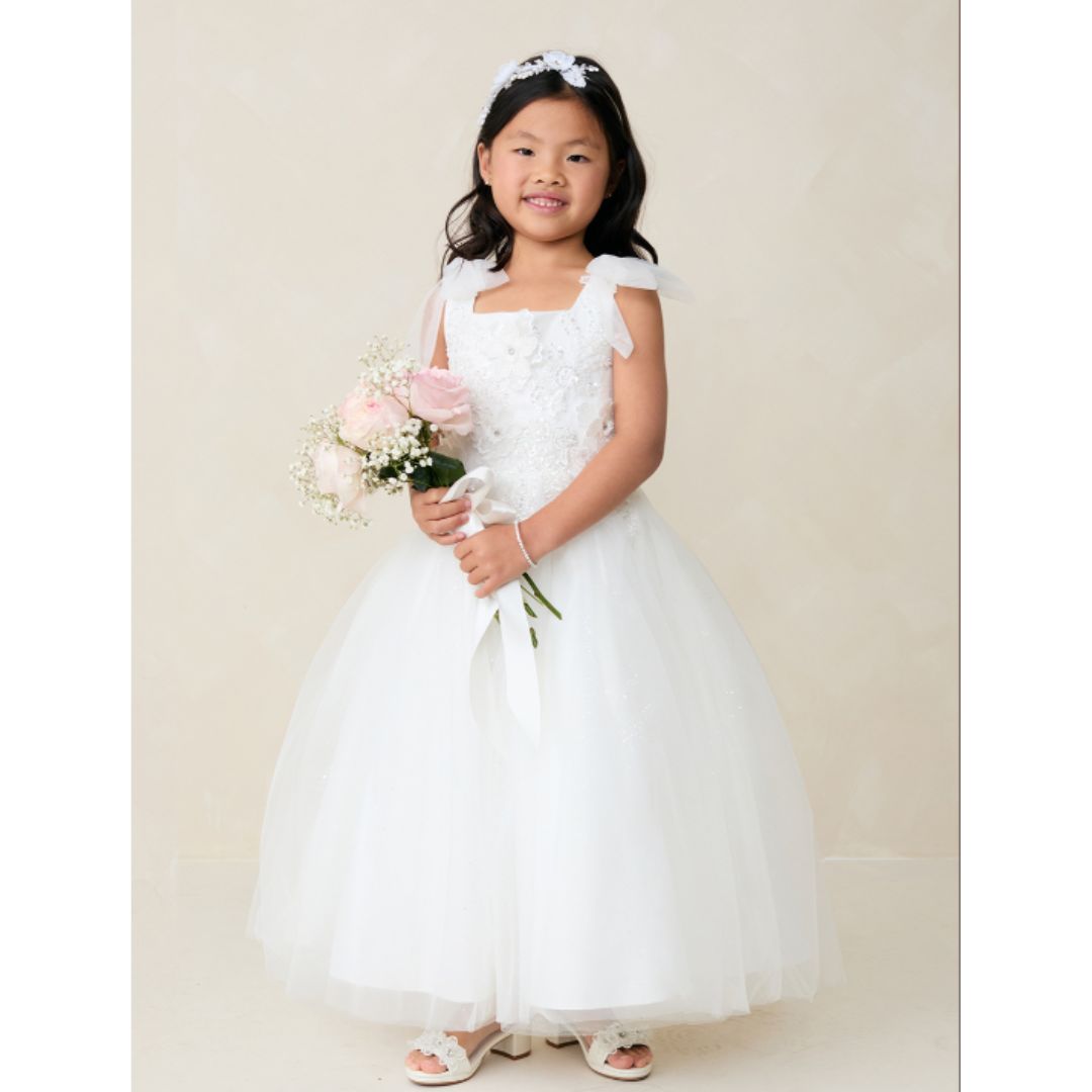 - Charming white flower girl dress by Tip Top, featuring straps decorated with tulle bows and delicate floral appliqués on the bodice. Its shimmery tulle skirt adds a magical touch, perfect for weddings, engagements, and special events. A tender and elegant design to wear on special occasions.