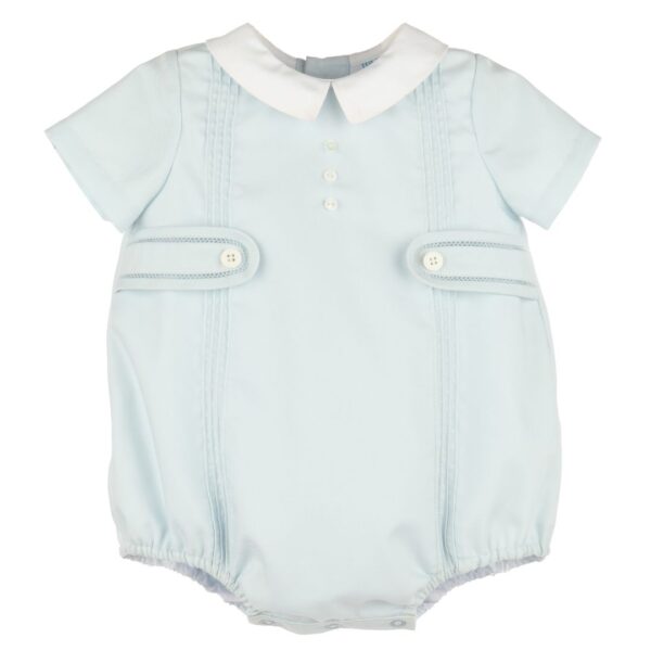 - Elegant baby romper from Luli and Me, made of soft sky blue fabric with a contrasting white collar. Its classic design includes small decorative buttons on the front and paneled details and side buttons for a refined, traditional style. Elasticated legs ensure comfort, while snaps at the bottom make changing easy. An ideal garment for special occasions or for everyday wear.