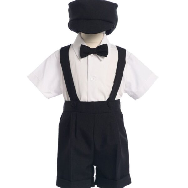- This distinguished black set from Lito is designed for formal events and elegant occasions. It includes a short-sleeved white shirt paired with a white bow tie, black shorts with matching suspenders, and a matching black beret. The pleats and decorative buttons enhance its classic style, offering a neat and sophisticated appearance. Perfect for weddings, parties, or presentations, this set guarantees style and comfort.