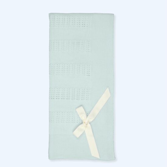 • Mac Ilusión presents this charming knitted blanket in a sweet pastel pink, designed to provide softness and warmth for your baby. With delicate openwork details and an elegant cream silk bow, it’s perfect for every special moment, both at home and on the go.