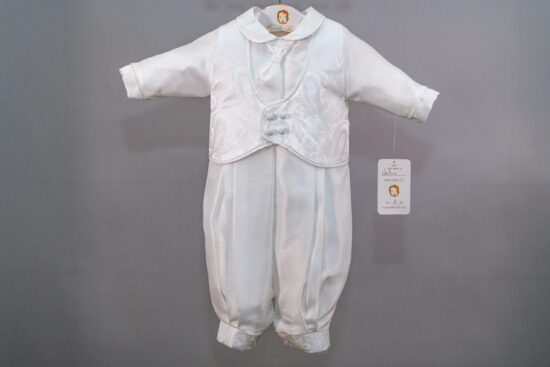 Suit details:Soft ivory white color, which provides an air of purity and distinction.One-piece design, ensuring comfort and ease when dressing baby.Brocade vest with a paisley pattern, which adds a sophisticated and elegant touch.Matching covered buttons on the vest, for a harmonious finish.Integrated tie, giving a formal and charming touch.Peter Pan collar made of smooth fabric that subtly contrasts with the vest.Bloomers with pleats and lace on the cuffs, for a classic and tender style.Long sleeves, ideal for events in any season
