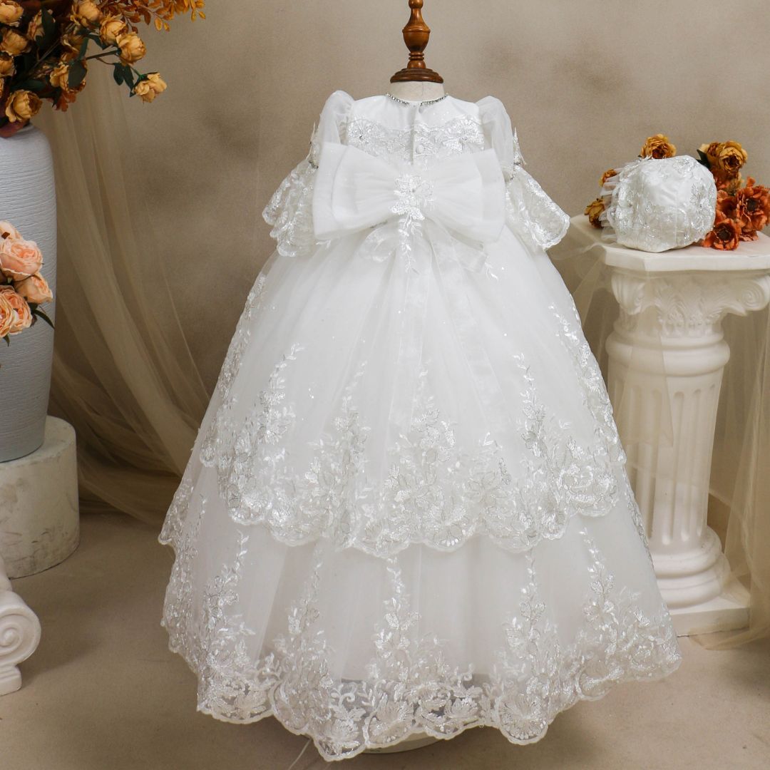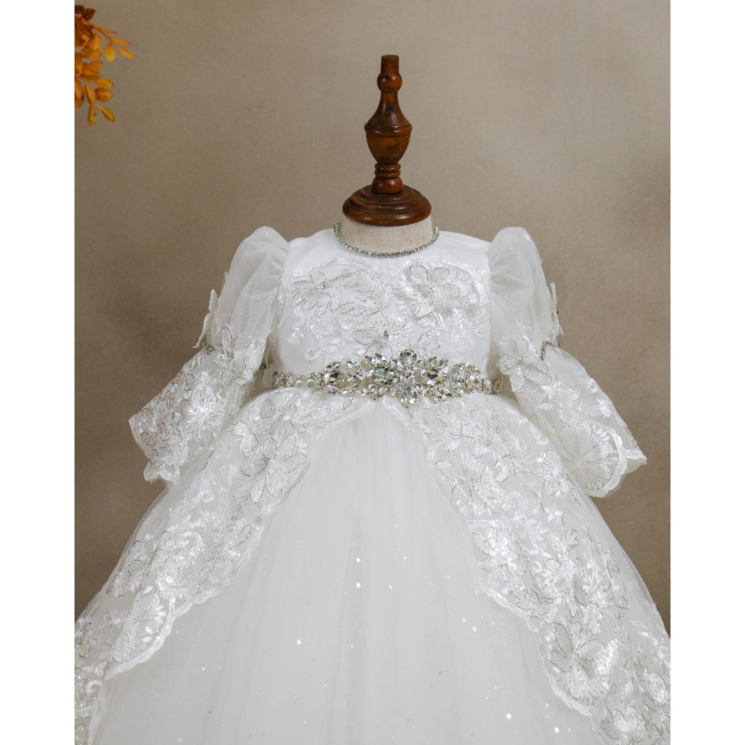 - A majestic and delicate formal dress, ideal for a Baptism or First Communion. Crafted from soft tulle with fine floral embroidery and a subtle shimmer that creates an ethereal effect. Its puffed sleeves and embellished belt enhance the silhouette with a classic and refined touch. An elegant and timeless design, perfect for a day filled with faith, love, and unforgettable moments.