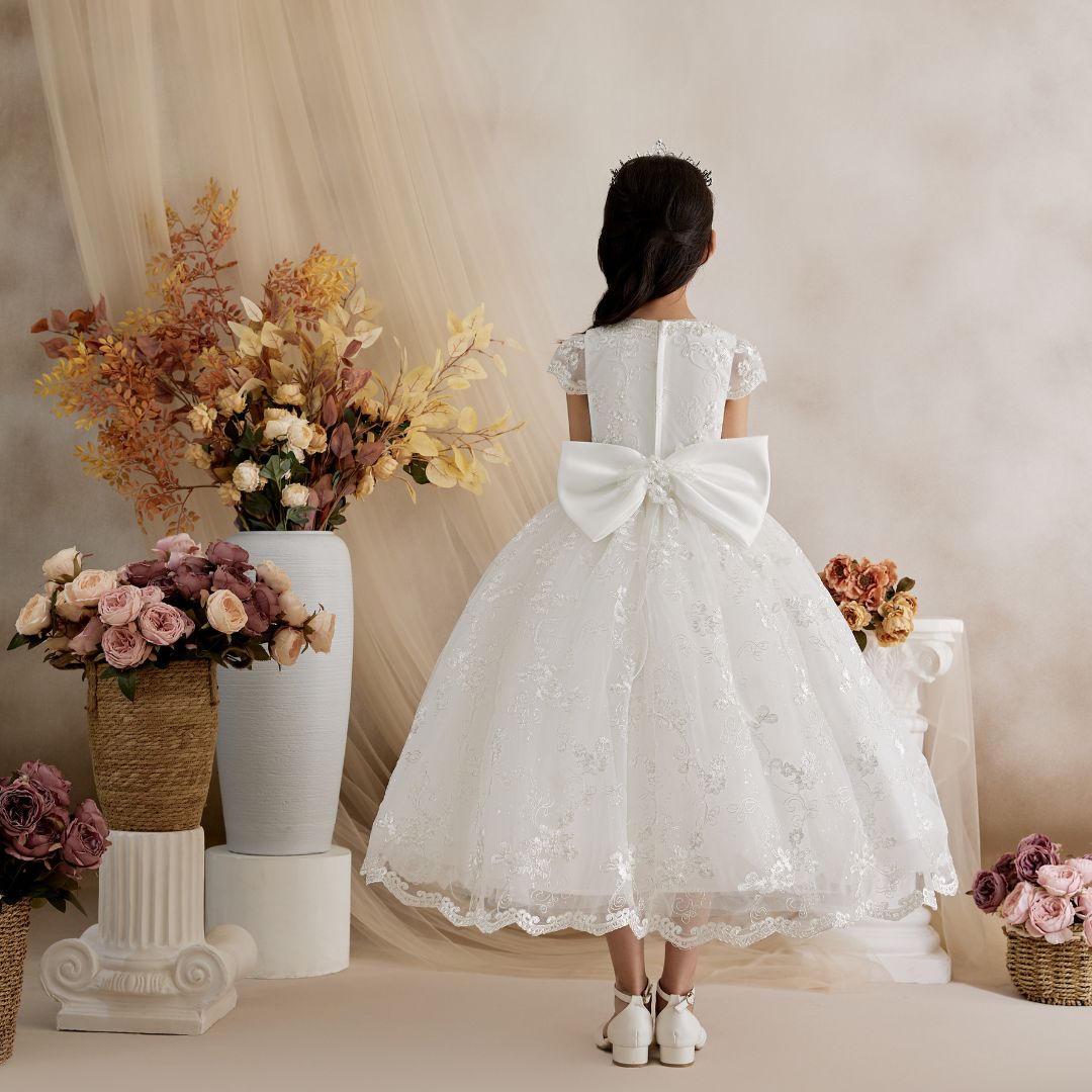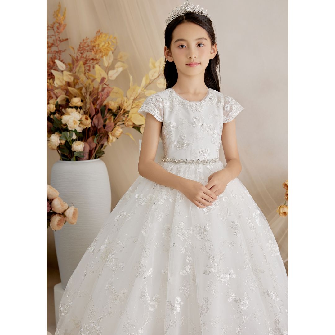 - This dress is ideal for First Communion, crafted from delicate floral lace that covers the bodice and flows subtly over a full tulle skirt. Its slim waistband adds a touch of understated sparkle, enhancing the silhouette with elegance and harmony. A classic, romantic, and sweet design for such a special day.