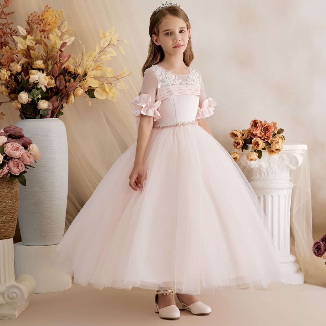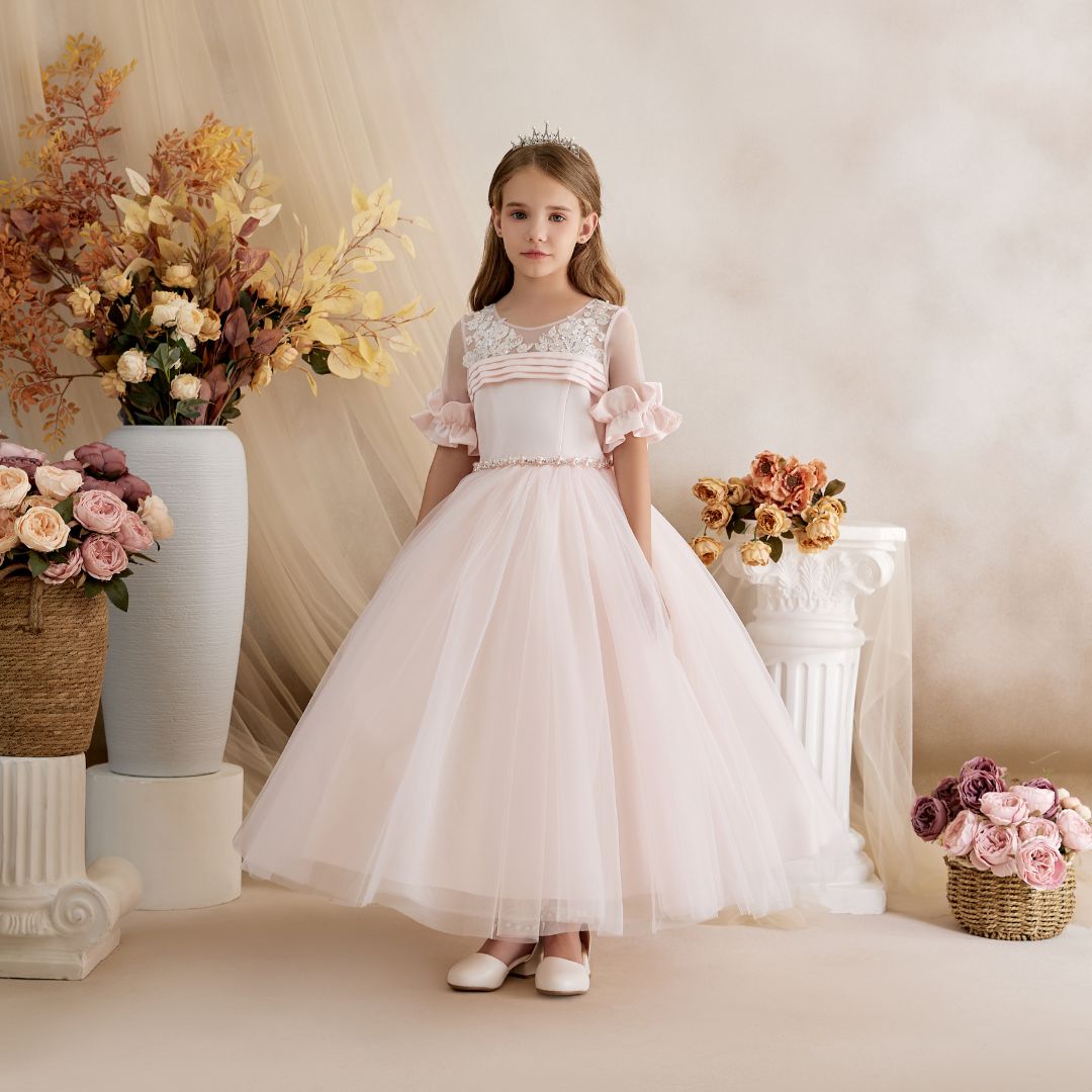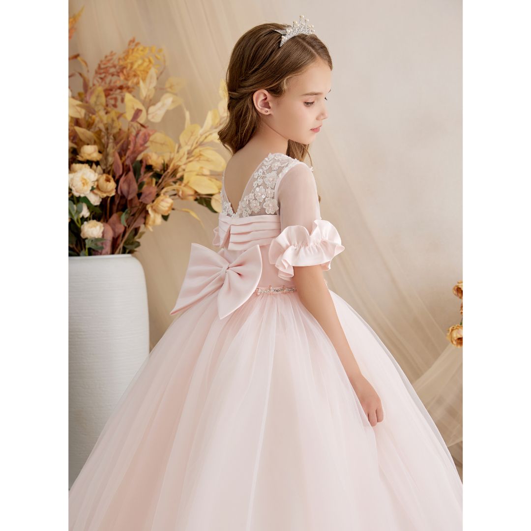 - Spectacular Princess Daliana party dress. Featuring a floral lace V-back, ruffled sleeves, and a large satin bow at the back. Its multi-layered tulle skirt creates a dreamy volume perfect for any celebration.