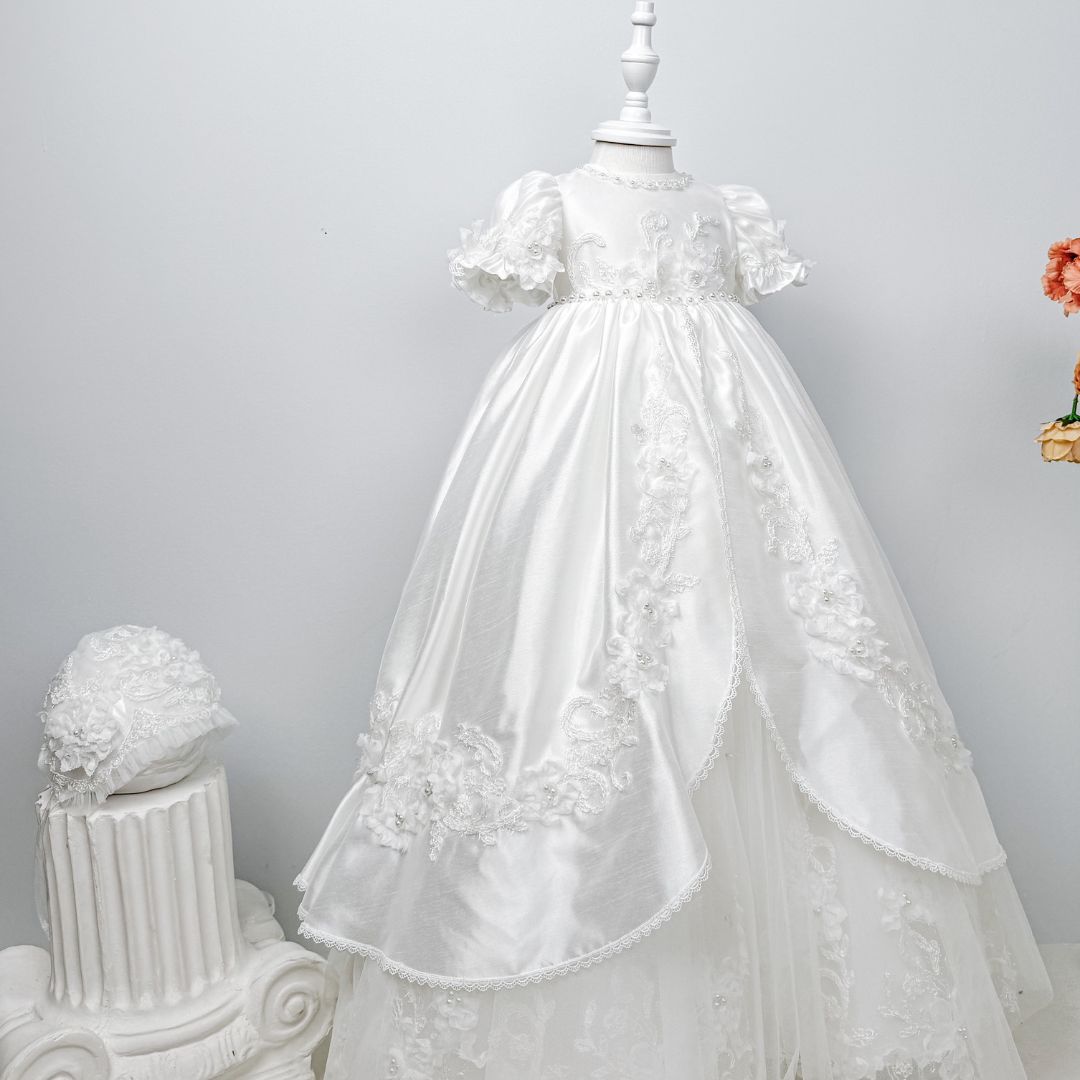 • Exclusive premium christening gown by Princess Daliana. Double-layered design in satin and tulle with pearl embroidery and French lace. Includes a matching bonnet. Elegance and tradition for an unforgettable christening.