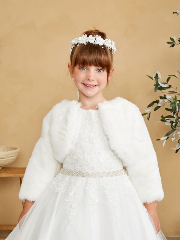 - Children’s bolero made of soft white faux fur, long sleeves and short cut, perfect to complement communion dresses, weddings or formal events. Its classic and elegant design provides warmth without detracting from the overall delicacy, providing a sophisticated and cozy touch. This bolero is ideal for cool weather, adding a refined finish to any little princess’s look