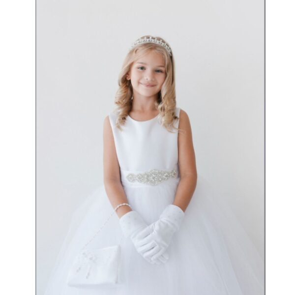 - Make your little one dazzle with this dress from the Flower Girl collection by renowned brand TipTop. Featuring a classic sleeveless design, a flowing tulle skirt, and a delicate beaded sash at the waist, this pure white dress is ideal for weddings, first communions, and special events. Its princess cut and impeccable workmanship will make her feel like royalty.