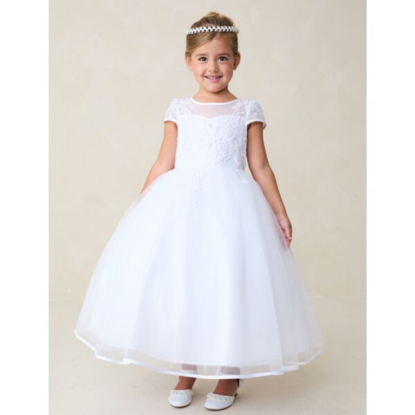 - Make your little one look like a princess for any special occasion with this charming Tip Top Flower Girl dress. Crafted in an elegant white hue, it features a delicate floral lace-embroidered bodice, short sleeves, and a flowing tulle skirt that provides volume and movement. The design includes a soft lining for comfort, while the details on the top add a sophisticated touch. Ideal for weddings, communions, or formal events. Complete the look with a tiara and white shoes for a truly enchanting style.