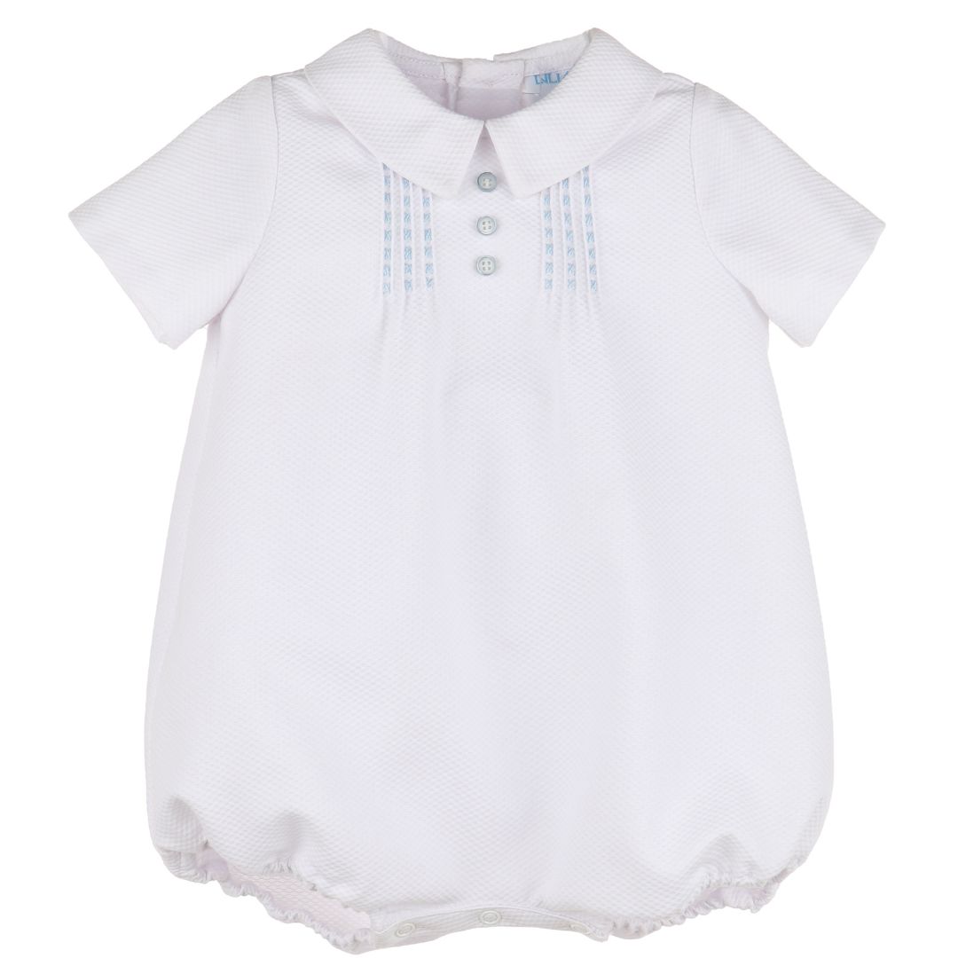 - Elegant white romper from Luli and Me with a classic collar, front buttons, and delicate light blue stitching. Ideal for special occasions or a cool and comfortable everyday look.